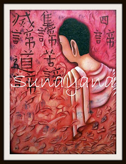 Its an Oil on Canvas. The writing on this Painting reads the Four Nobel Truths by Buddha. The script is Chinese. I donot know the script well enough. So any one who knows the script and thinks, there is a mistake somewhere, is welcome to give suggestions.